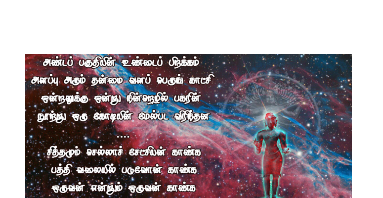 சித்தமும் செல்லாச் சேட்சியன் காண்க! பத்தி வலையில் படுவோன் காண்க! ஒருவன் என்னும் ஒருவன் காண்க! விரி பொழில் முழுதாய் விரிந்தோன் காண்க! அணுத் தரும் தன்மையில் ஐயோன் காண்க!